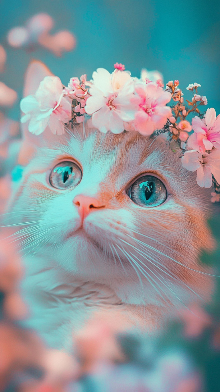 Feminim vibe cat with angel flowers in her head esthetic